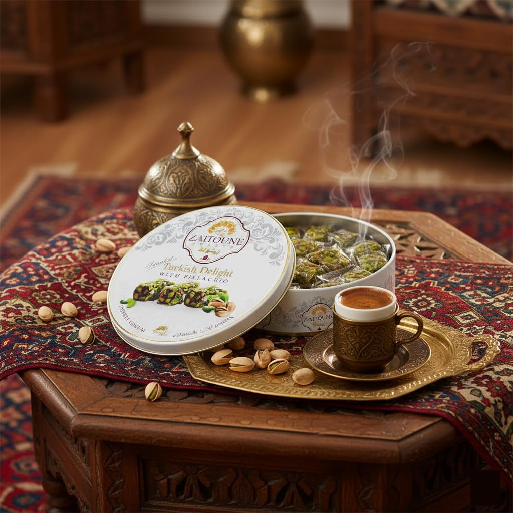 Zaitoune Pistachio Covered Turkish Delight – 0.55 lb | Stuffed with Delicious Nuts, Coated with Chopped Pistachios | Authentic Luxury Lokum Turkish Delight Candy in a Beautiful Gift Tin | Handmade & Individually Wrapped | Perfect Turkish Snacks