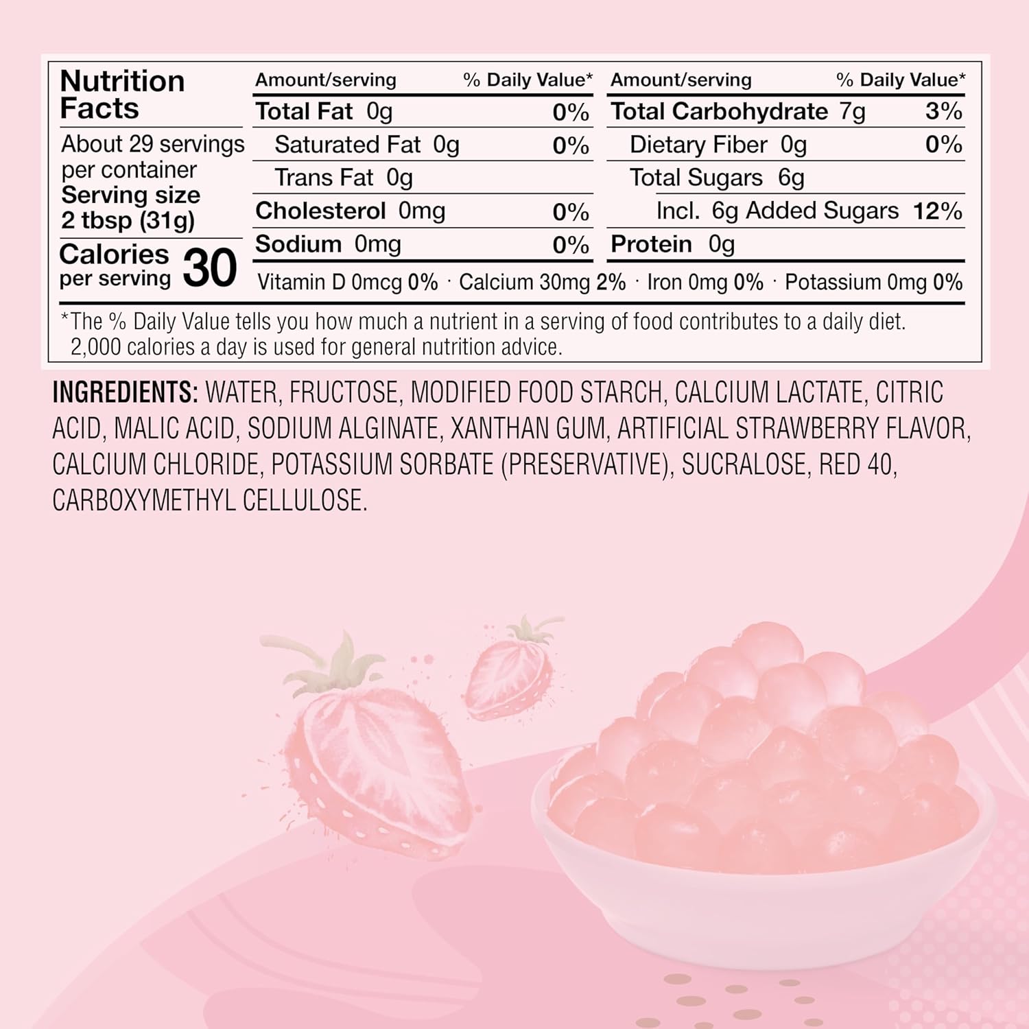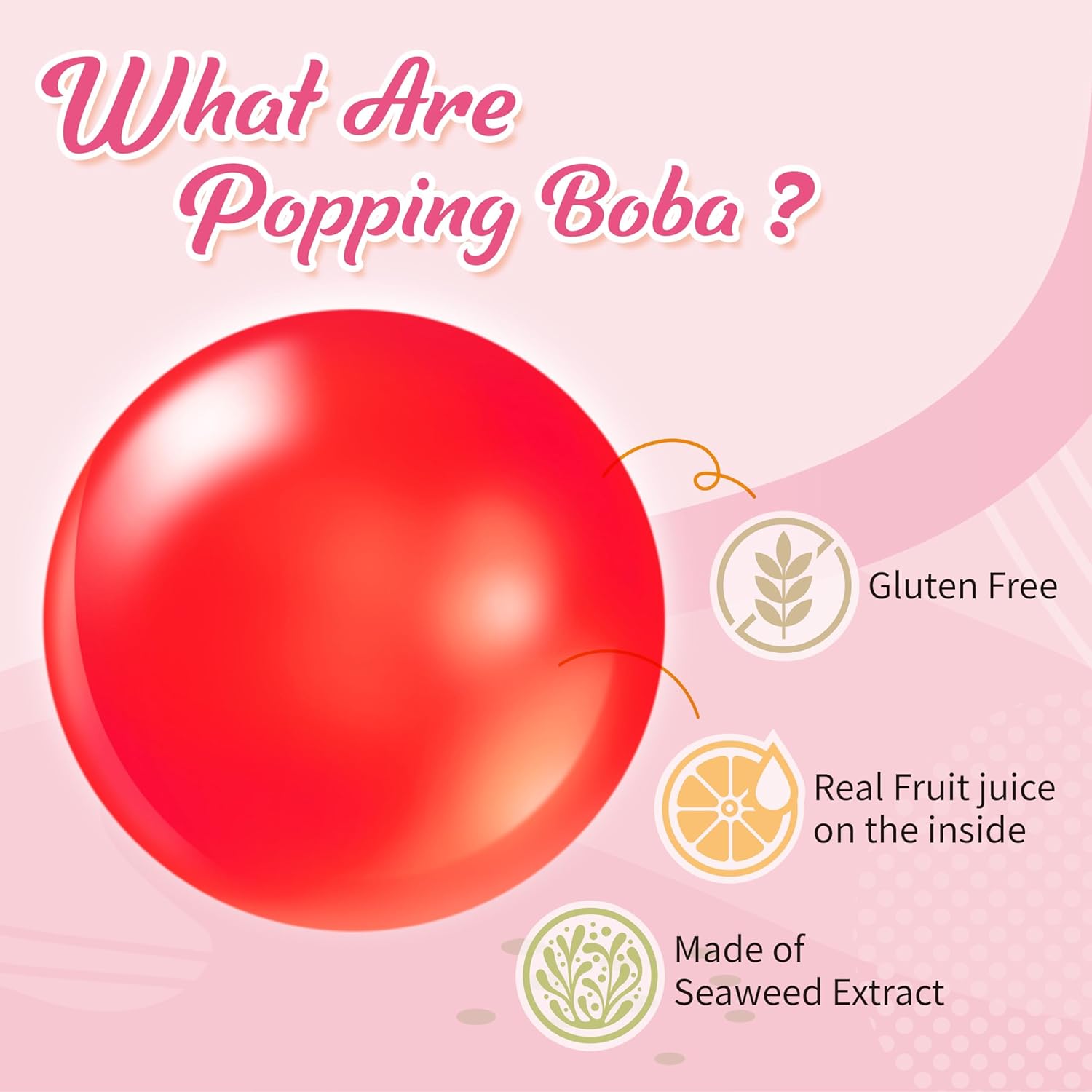 - POPPING BOBA STRAWBERRY - Featuring our original popping boba with delicious fresh strawberry flavor. Transform your desserts and beverages with our versatile Strawberry Boba pearls.