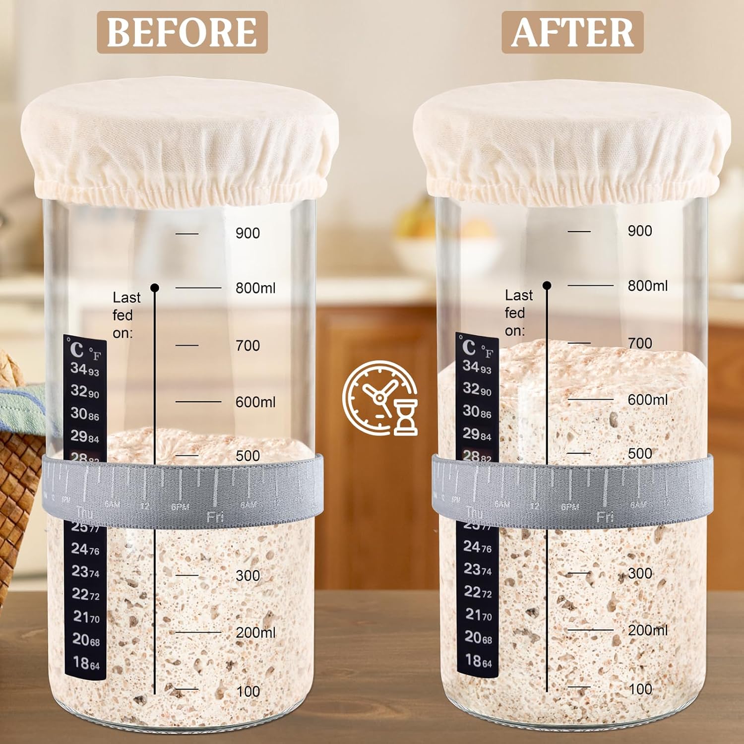 - Large capacity and easy to useThe sourdough jar has a 35 oz capacity and makes 4 sourdough loaves. You can easily add flour and water to this wide-mouth glass jar and remove the starter when needed. A spatula aids in the efficient stirring, and a temperature sticker helps you monitor the starter temperature in real-time. The Date/time feeding tape helps you keep track of time. Easy to observe and clean (dishwasher safe).