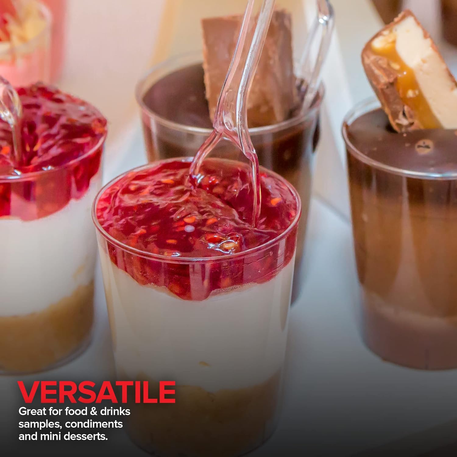 - BPA-Free & Recyclable: Beautifully display jello shots, wine samples, food samples, dessert samples, condiments, dipping sauces, and more in our crystal clear 1.5-ounce plastic shot glasses. Made of premium quality, durable polystyrene, our plastic clear shots cups are food grade, BPA-free, and recyclable. Designed with a rolled rim, our hard plastic shot cups don’t have sharp edges. The tapered sides make our shot glasses a comfortable fit in your hand.