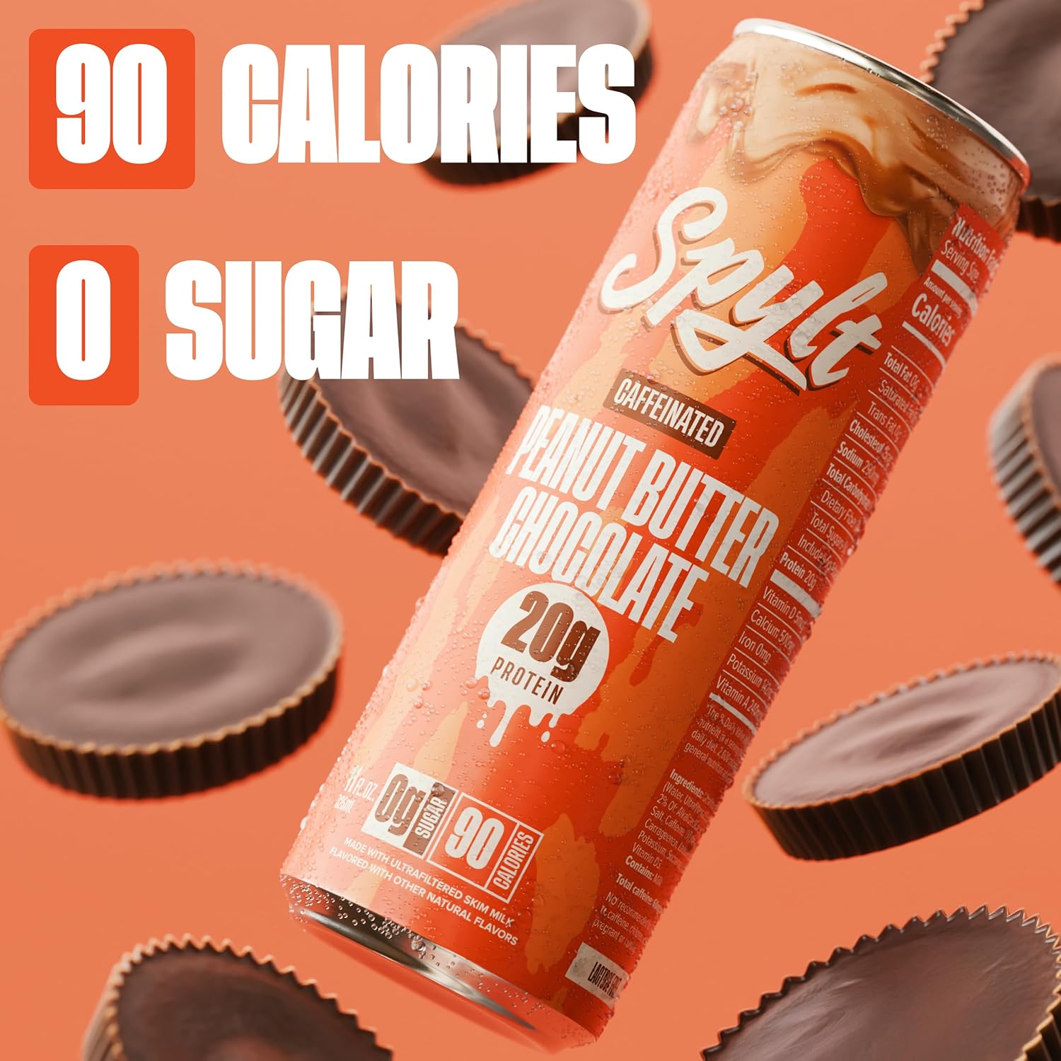 - CAFFEINATED PROTEIN BOOST: Peanut Butter Chocolate Milk with a giant caffeinated kick in the pants. With 60mg of liquid caffeine, and 20g of protein milk, SPYLT is your caffeinated compadre and AFTERNOON PICK ME UP!
