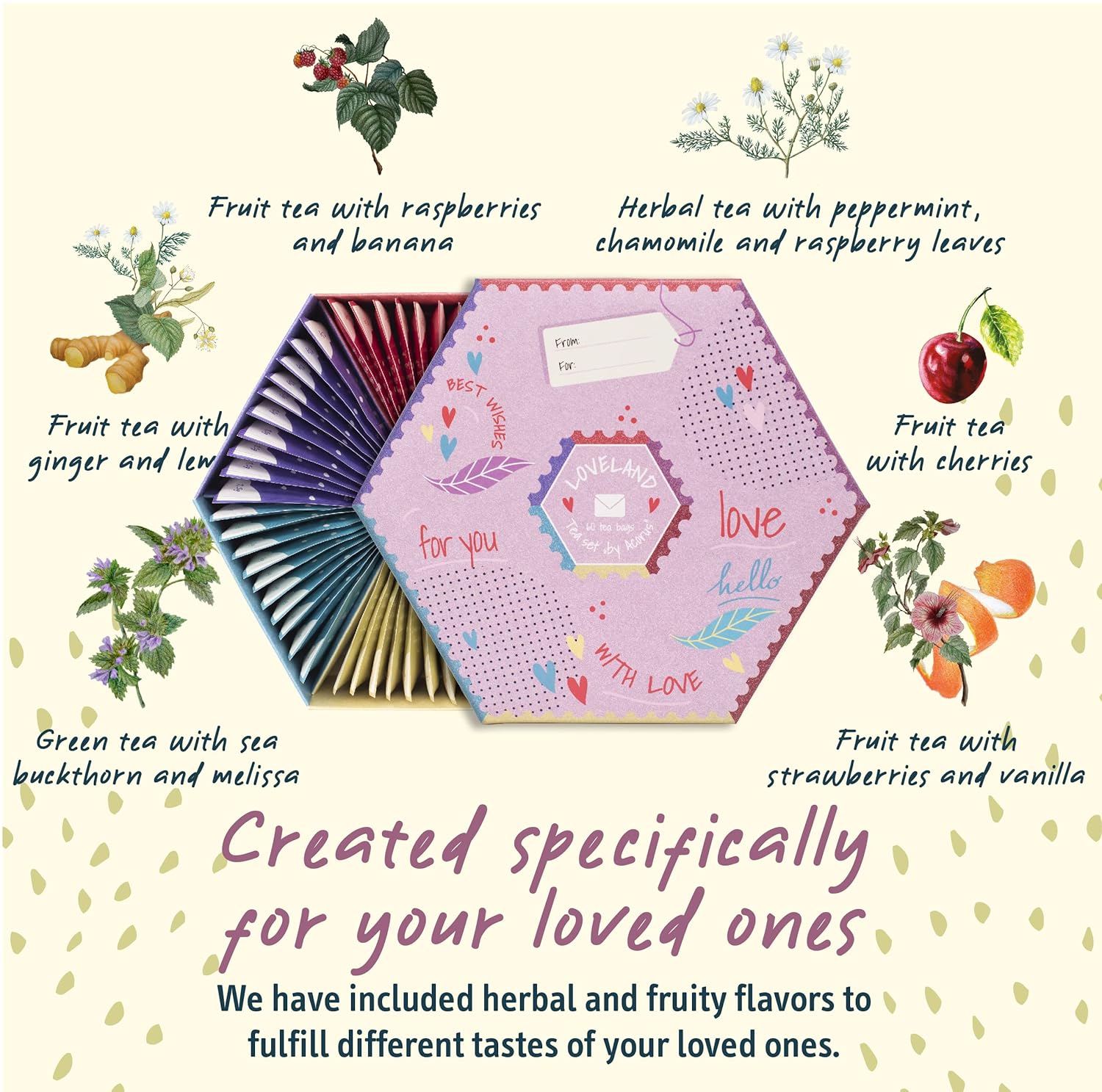 - A DIVERSE FLAVOR EXPERIENCE. From soothing Herbal Tea to vibrant fruit blends like Strawberry Vanilla, Raspberry Banana, and Cherry, Loveland offers a rich variety to satisfy every palate. Unique flavors include Green Tea with Sea Buckthorn and Melissa, Ginger Lemon, and more – a perfect combination for a delightful tea journey.