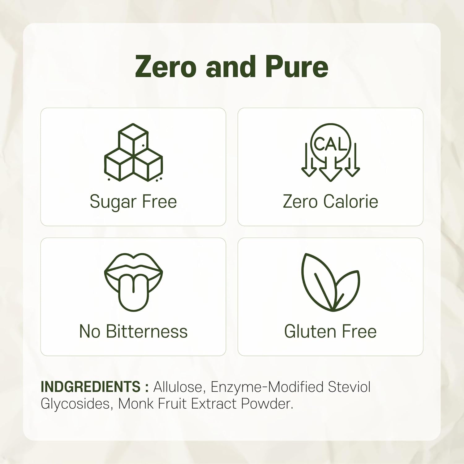 - NATURAL INGREDIENTS, NO UNNECESSARY SYNTHETIC ADDITIVES: Allulose, Monk fruit, Sterol glycosides - We've combined the simplest ingredients to create sweetness, excluding unnecessary synthetic additives like low-grade enzymatically-treated stevia and erythritol.