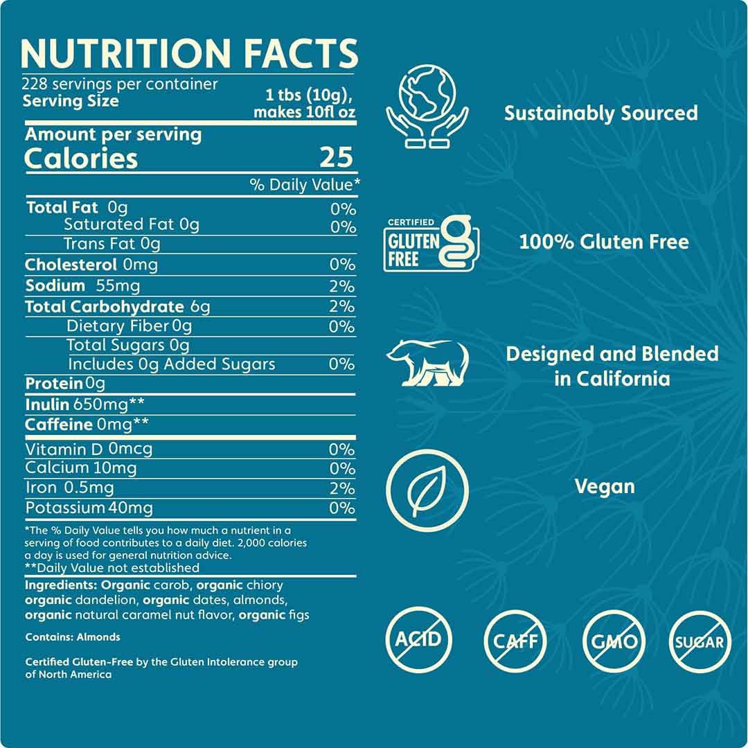 - DETOX DELICIOUSLY - Creamy caramel & golden roasted almonds are deepened by roasted chicory & dandelion roots. Slightly sweet from dates & figs. Rich, bold flavor that’s smoother than coffee! No artificial flavors, chemicals, MSG, or preservatives. Non-GMO, organic herbs.