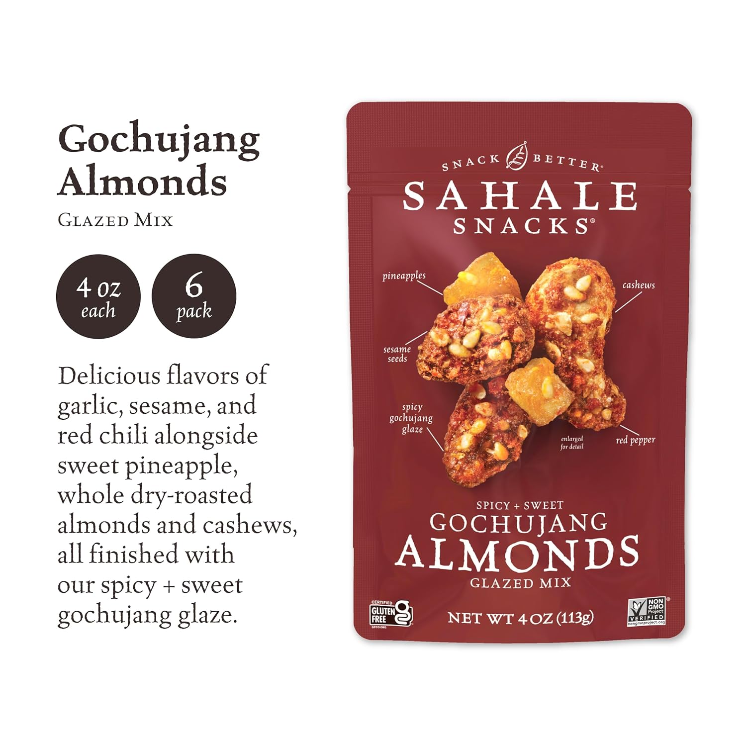 - Sahale Snacks Gochujang Almonds Glazed Mix, Kosher, Gluten Free, 4 Ounce (Pack of 6)