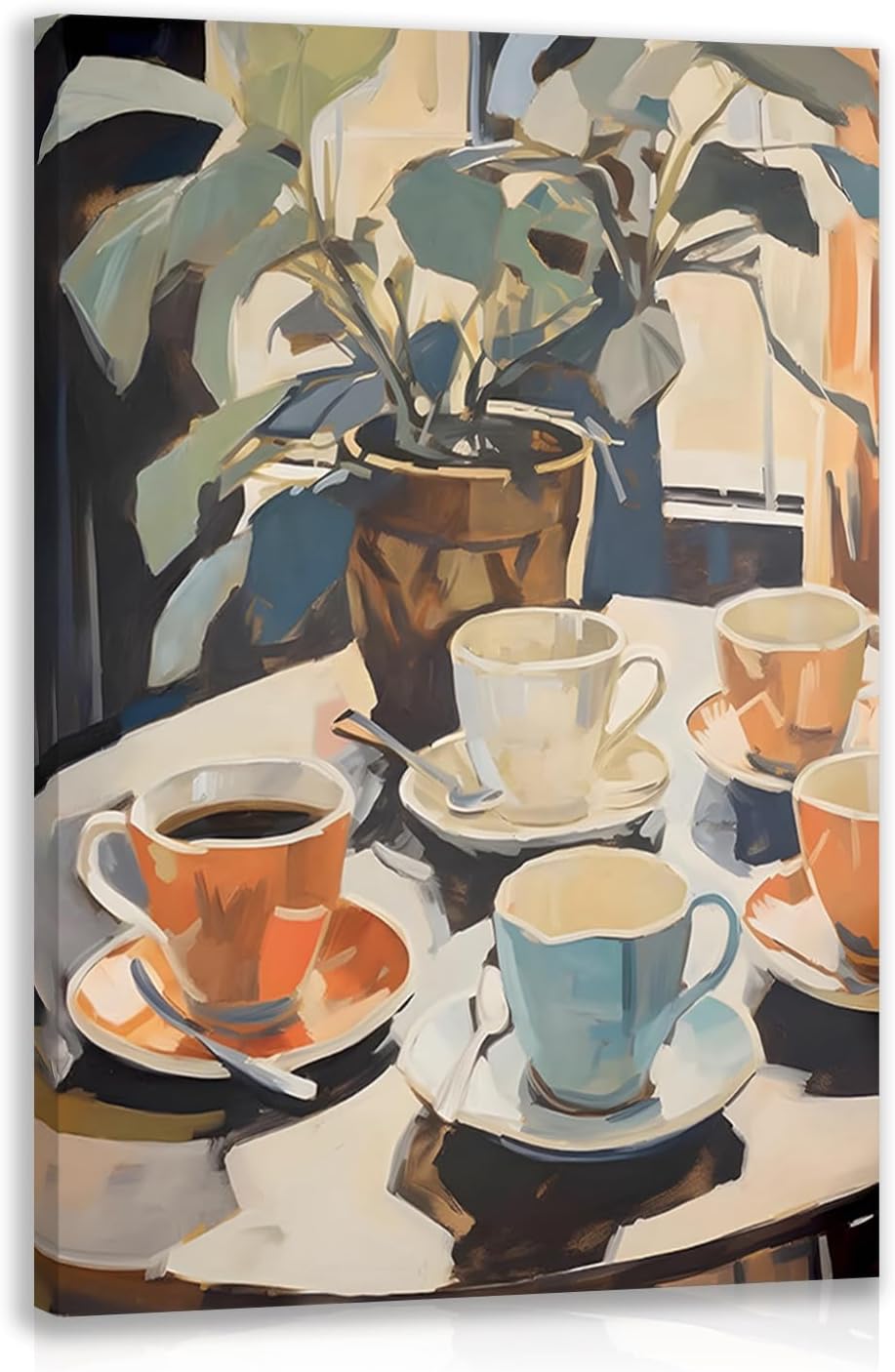 - Vintage Coffee Wall Art: This 12x16-inch coffee painting beautifully depicts a warm and inviting café moment, where a charming collection of vintage-style teacups and coffee mugs sit gracefully on a rustic wooden table. A potted plant bathes in the soft natural light filtering through the window, enhancing the cozy and timeless ambiance. Whether you're a coffee enthusiast or love the charm of a cocktail party setting, this retro-inspired artwork adds a welcoming touch to any space.