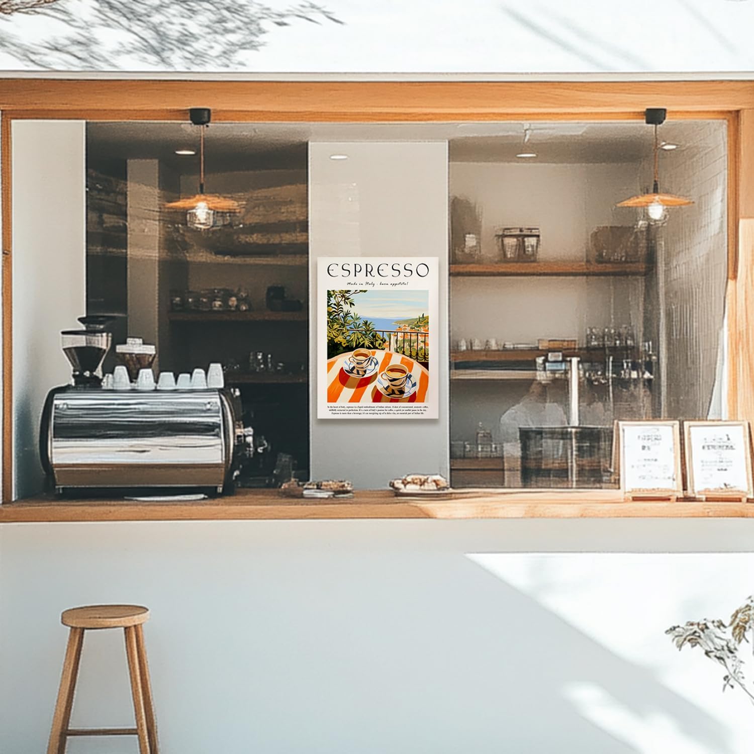 - Vintage Italian Espresso Design: This 16x24 inch coffee poster brings the essence of Italian café culture into your home. Featuring a beautifully illustrated Mediterranean seaside view with two classic espresso cups on a striped table, this artwork captures the relaxed elegance of “dolce far niente”—the sweetness of doing nothing. The vintage-inspired aesthetic blends soft, warm hues with a retro travel decor feel, making it a perfect addition to coffee corners, trendy bars, or stylish kitchens. Whether you're a fan of lattes, espresso martinis, or classic Italian coffee, this cool picture sets the perfect ambiance.