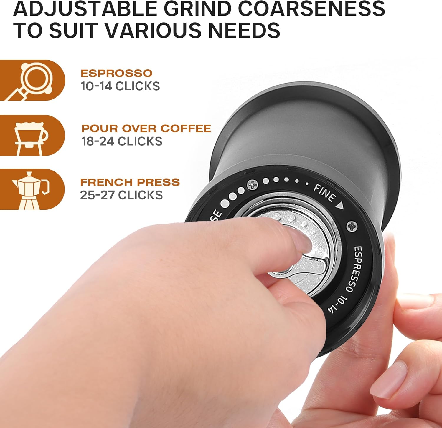 - 40 Adjustable Grind Settings for Perfect Coffee Every Time This manual coffee grinder features 40 precise grind settings, allowing you to customize the grind size for espresso, pour over, French press, and more. Whether you need fine grounds for a rich espresso or coarse grounds for a smooth cold brew, this coffee grinder delivers consistent results.