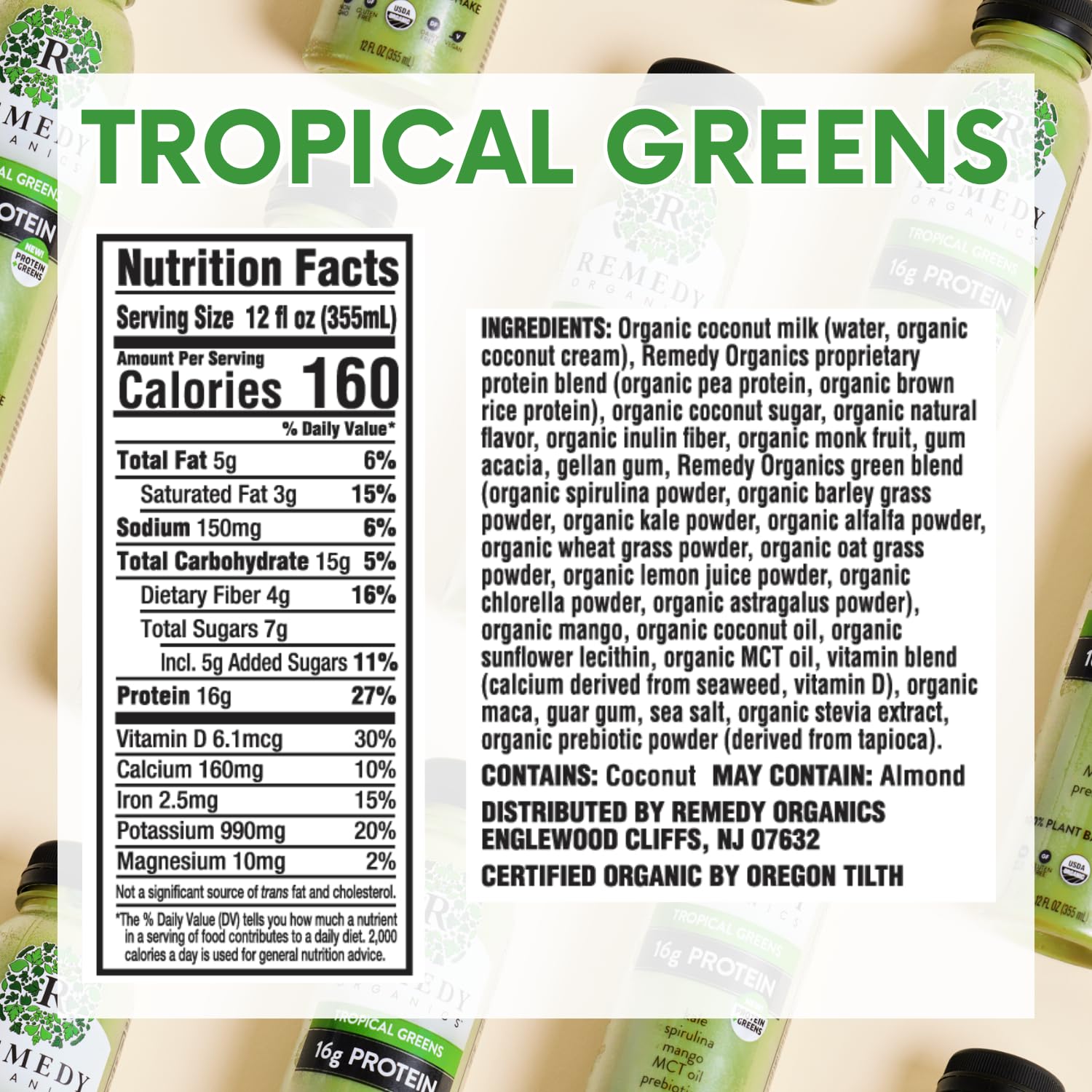 Remedy Organics Tropical Greens 12-Pack | Plant Based 16g Protein Shakes, Ready to Drink | USDA Organic, Gluten Free, Dairy Free, Soy Free