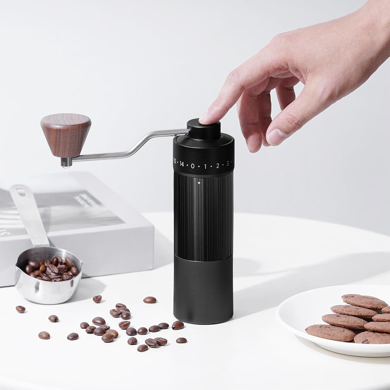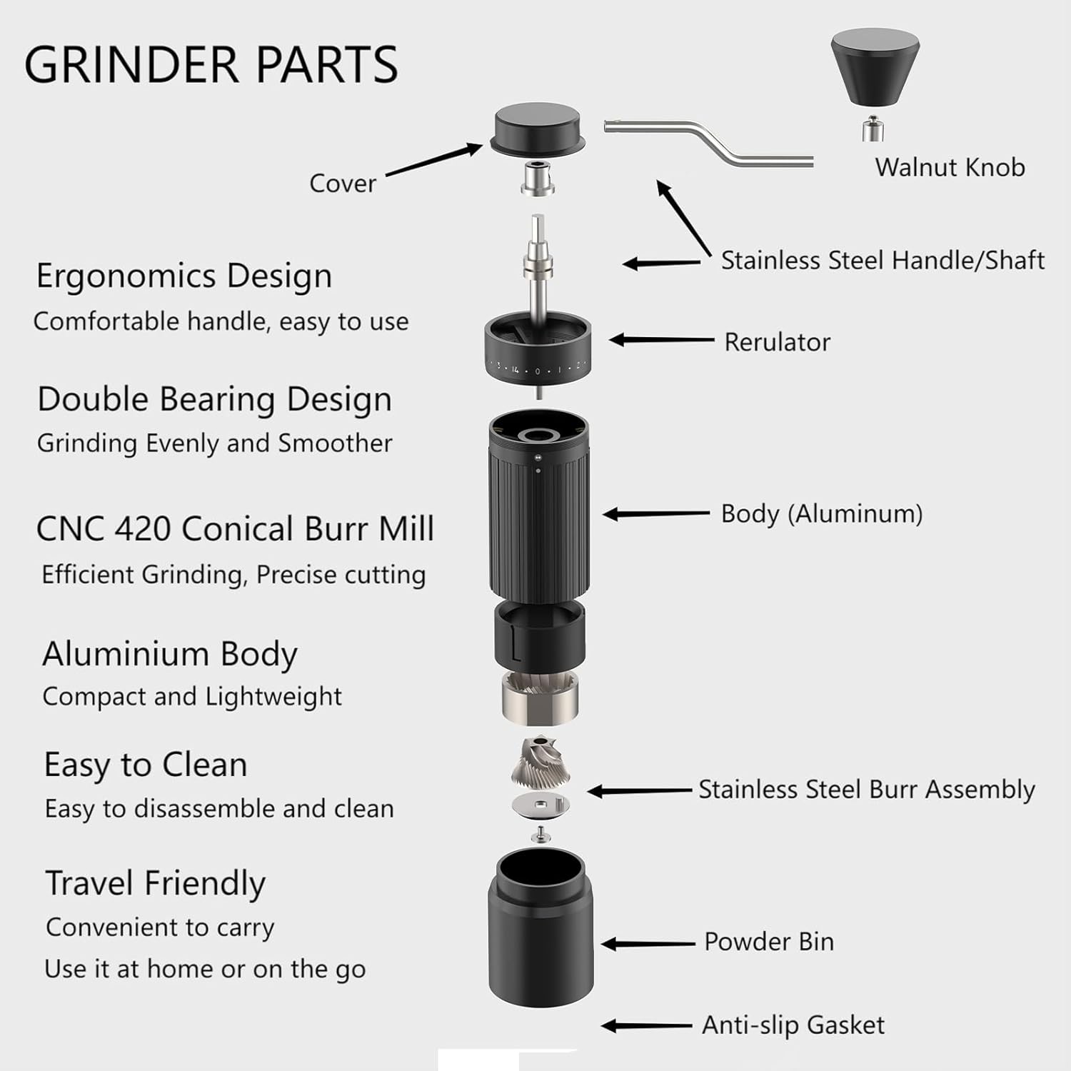 - 【Classic Roman Cylindrical Design】The classic Roman cylindrical coffee grinder, vertical stripe anti slip design features a better grip. The aviation grade aluminum alloy body enhances durability, and the vintage walnut wood handle enhances the operational hand feel.