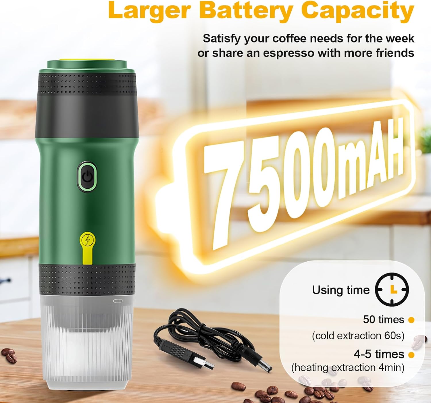 - Rechargeable Battery: The mini espresso machine is equipped with a 7500mAh rechargeable battery, which is compatible with car and USB charging. The red LED light is on when charging, and the green LED light is on when charging is complete. After fully charged, the number of extractions is 50 with cold water directly, 25 with hot water directly and 5 with cold water heated