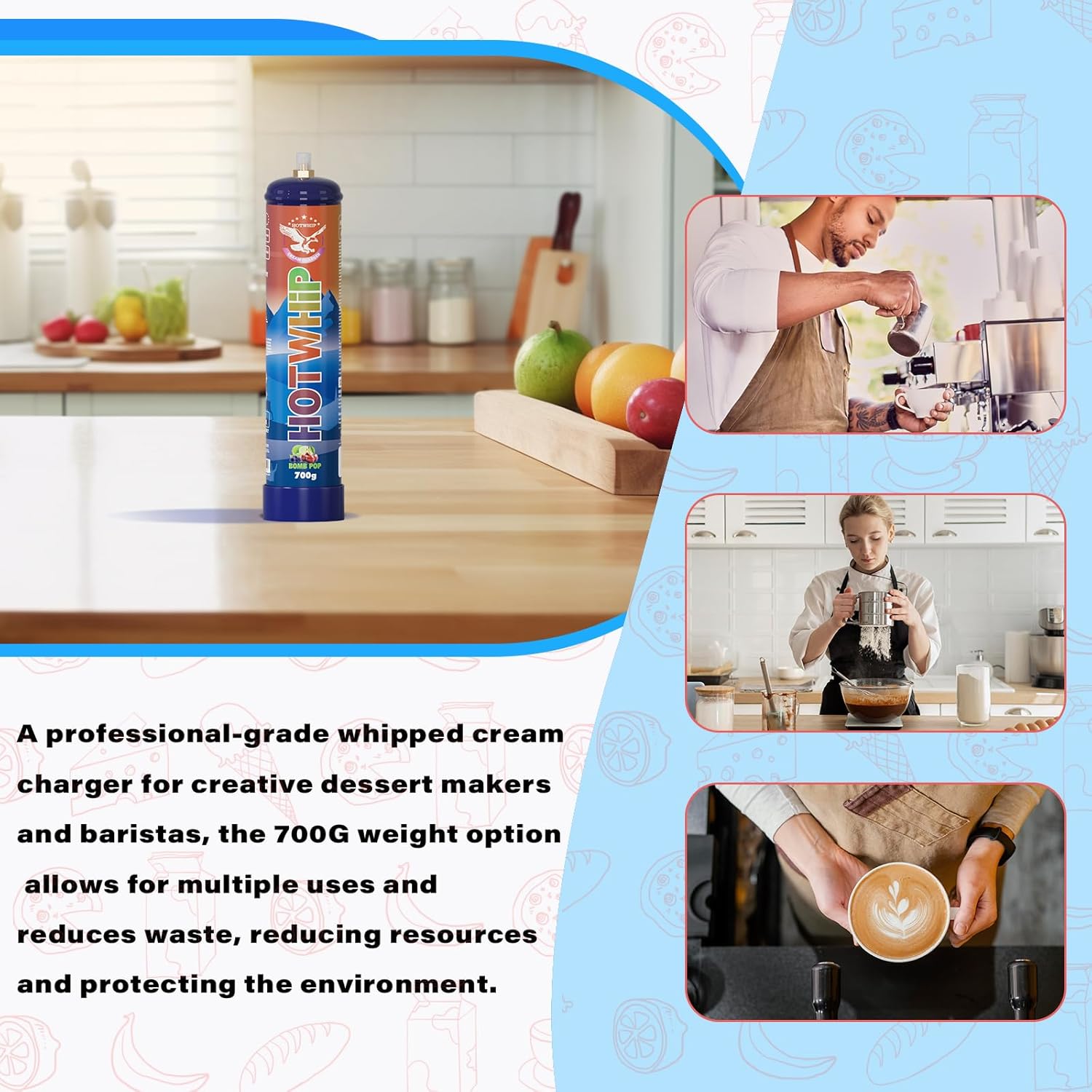 - 🍰【High volume & High purity】 700g 1.1 litres pure food grade whipped cream charger,Each of Hotwhip Whipped cream cylinders is precisely filled with 99.99% purity gas and ensures that your whipped cream is light, fluffy, and flavorful. The food-grade standard also ensures that the gas won’t alter the taste of your desserts or beverages.This high-capacity design allows you to create more whipped cream or infusions without frequent replacements, perfect for busy kitchens or large gatherings.