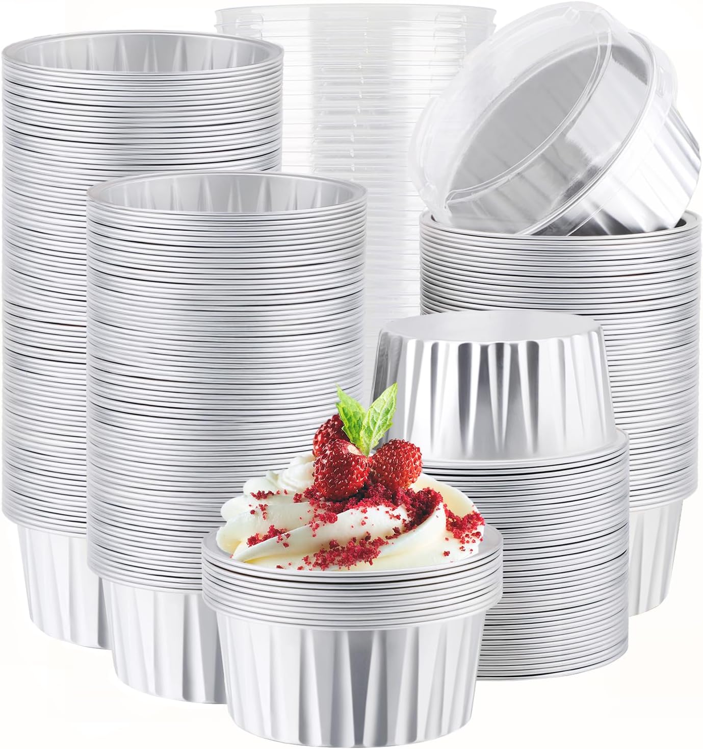EUSOAR Aluminum Foil Baking Cups, 400pcs 5oz Disposable Mini Ramekins Cupcake Liners with Lids for Baking, Dessert Containers Aluminum Cheesecake Pan Creme Brulee Cup for Oven-Silver
