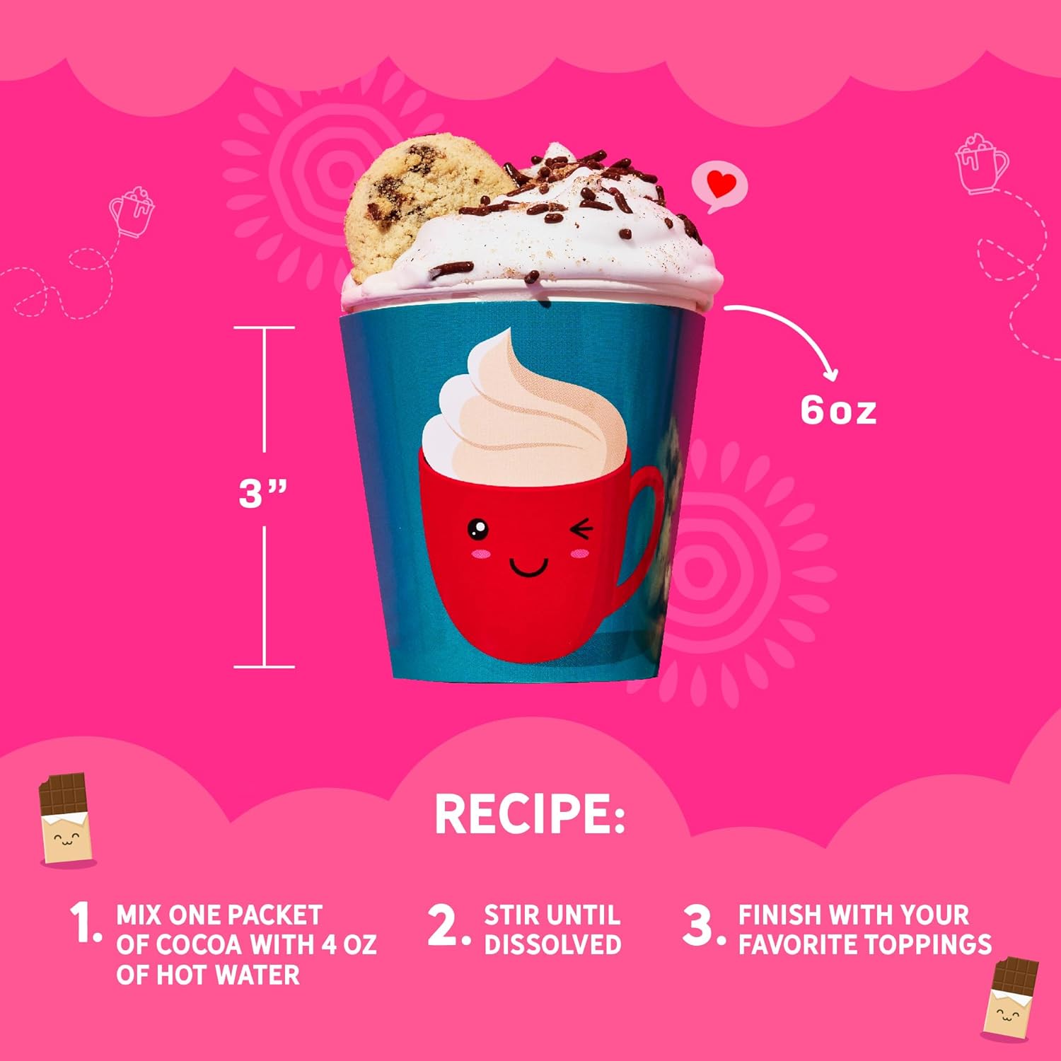 - HOT COCOA BAR SUPPLIES include mini cups, printed sleeves, marshmallows for hot cocoa and other fun toppings