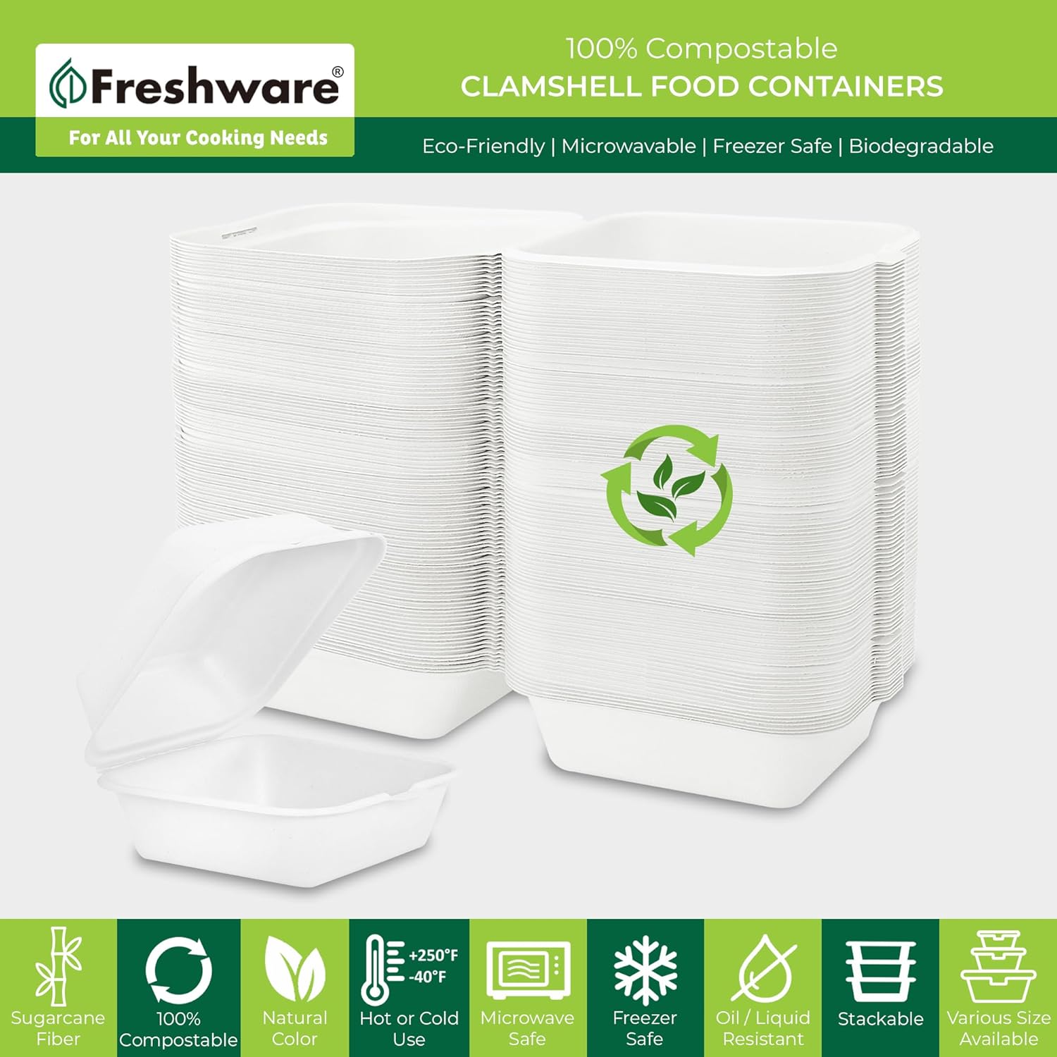 Freshware Clamshell Food Containers with Lids [6x6 100-Pack] Disposable To Go Containers, Biodegradable Sugarcane To Go Boxes - Paper Container - Microwave & Freezer Safe, Stackable