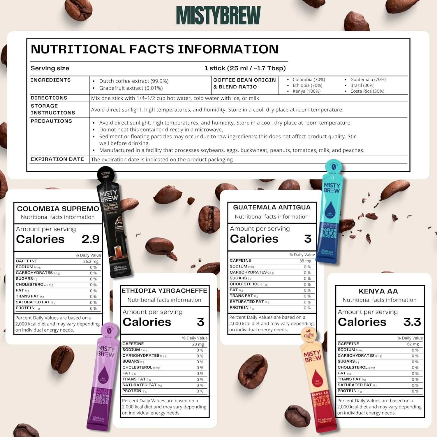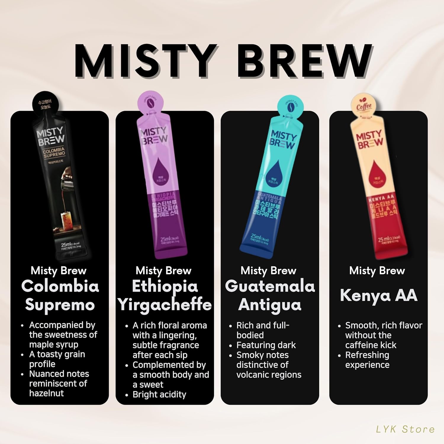 - Liquid Coffee, Cold Brew, Mistybrew, Colombia Supremo, Ethiopia Yirgacheffe, Guatemala Antigua, and Decaffeinated, Produced by Korea