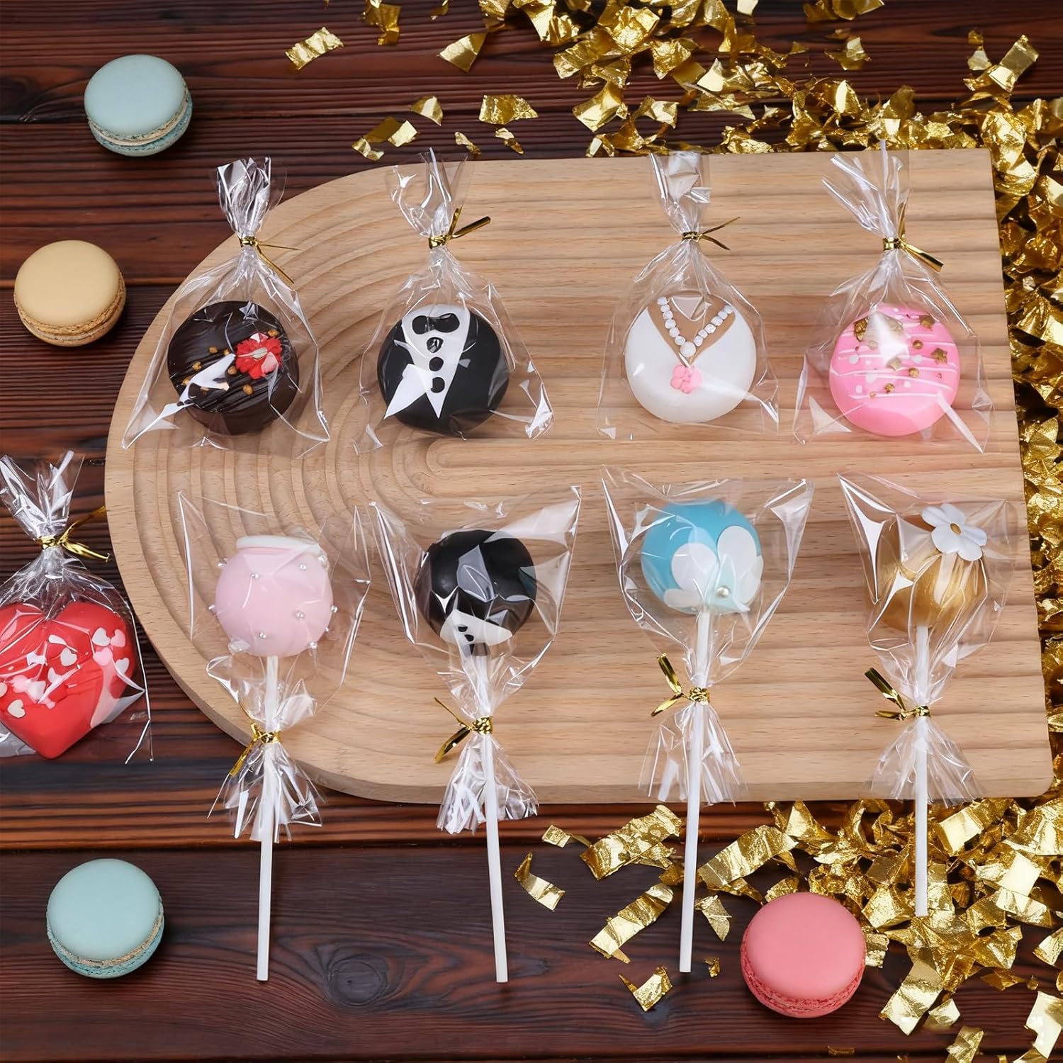 - Clear Cellophane Treat Bag: Flat cake pop bags, 3 inch by 5 inch; with 100 Pcs; Metallic twist ties: Gold, 2 mm x 60 mm, keep your treats fresh and clean