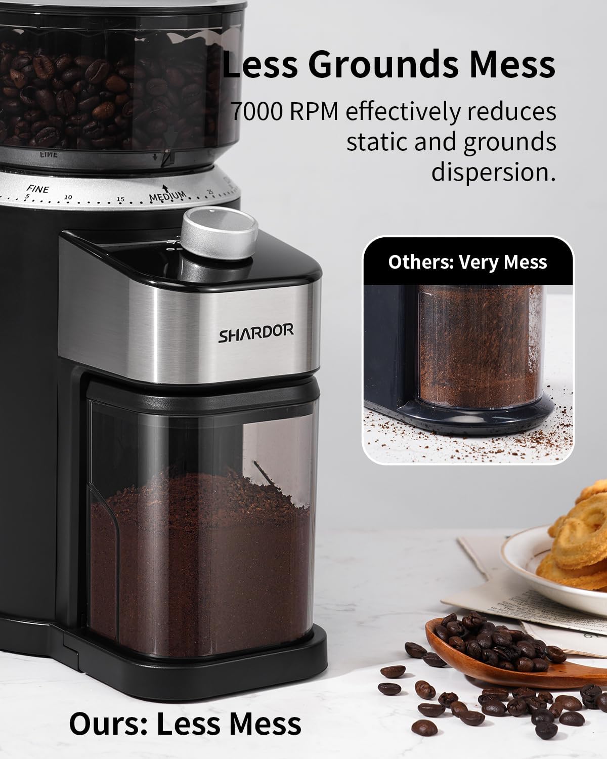 - [Minimize Static]The 7,000 RPM motor effectively reduces the static buildup, minimizing coffee grounds flying around.