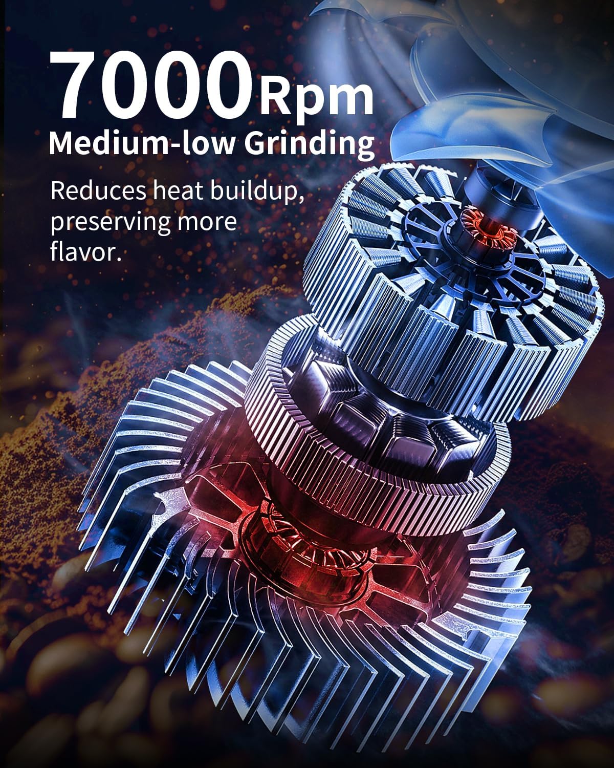 - [Uniform Grind, Rich Flavor] Metal flat burr coffee grinder with 7,000 RPM low-speed grinding to reduce heat buildup, ensure a more consistent grind, and preserve the full flavor of your coffee.