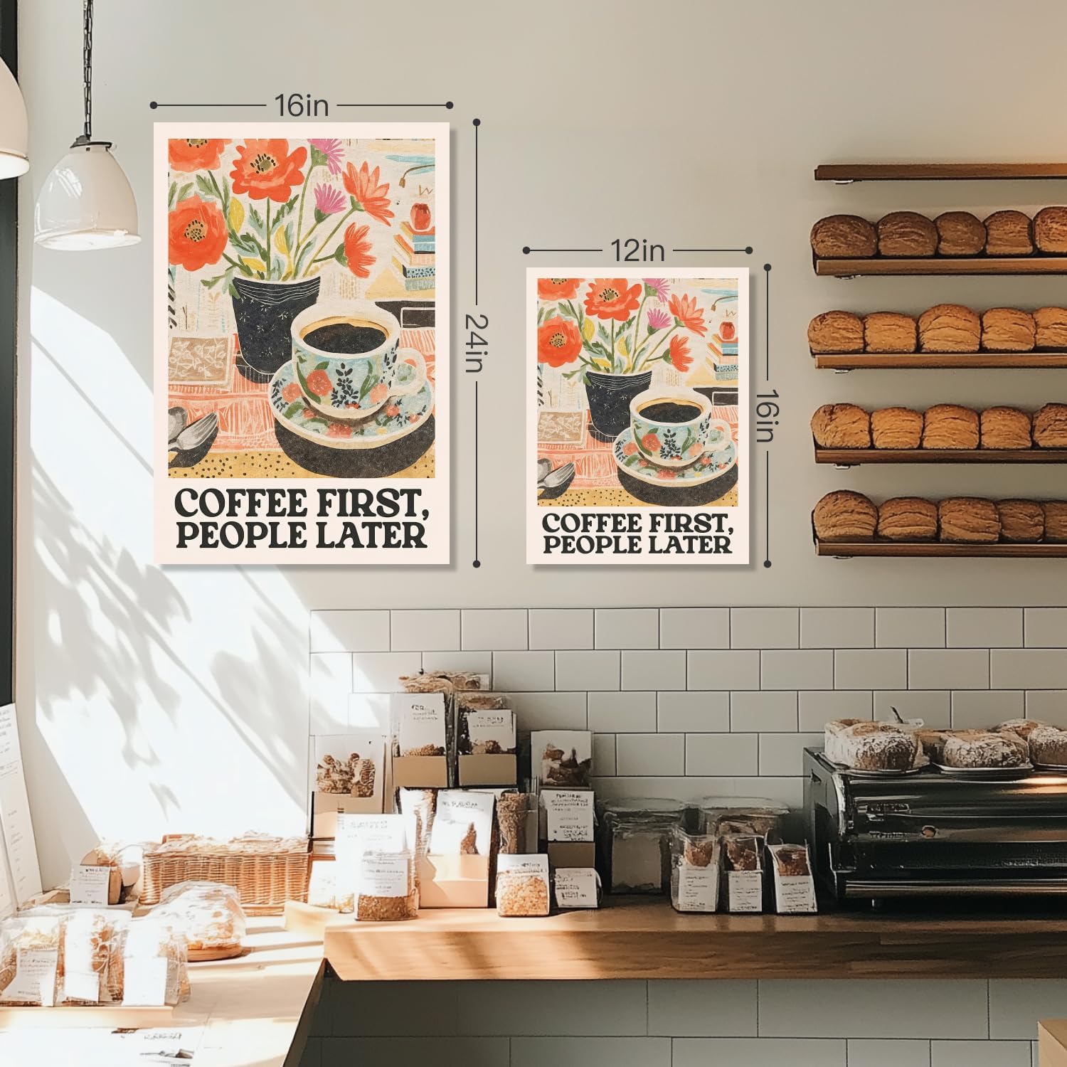 - Fun Coffee Wall Art: This wall art features a colorful retro-style coffee cup and floral design with the humorous phrase “Coffee First, People Later”. A perfect blend of cozy charm and playful personality for any space.