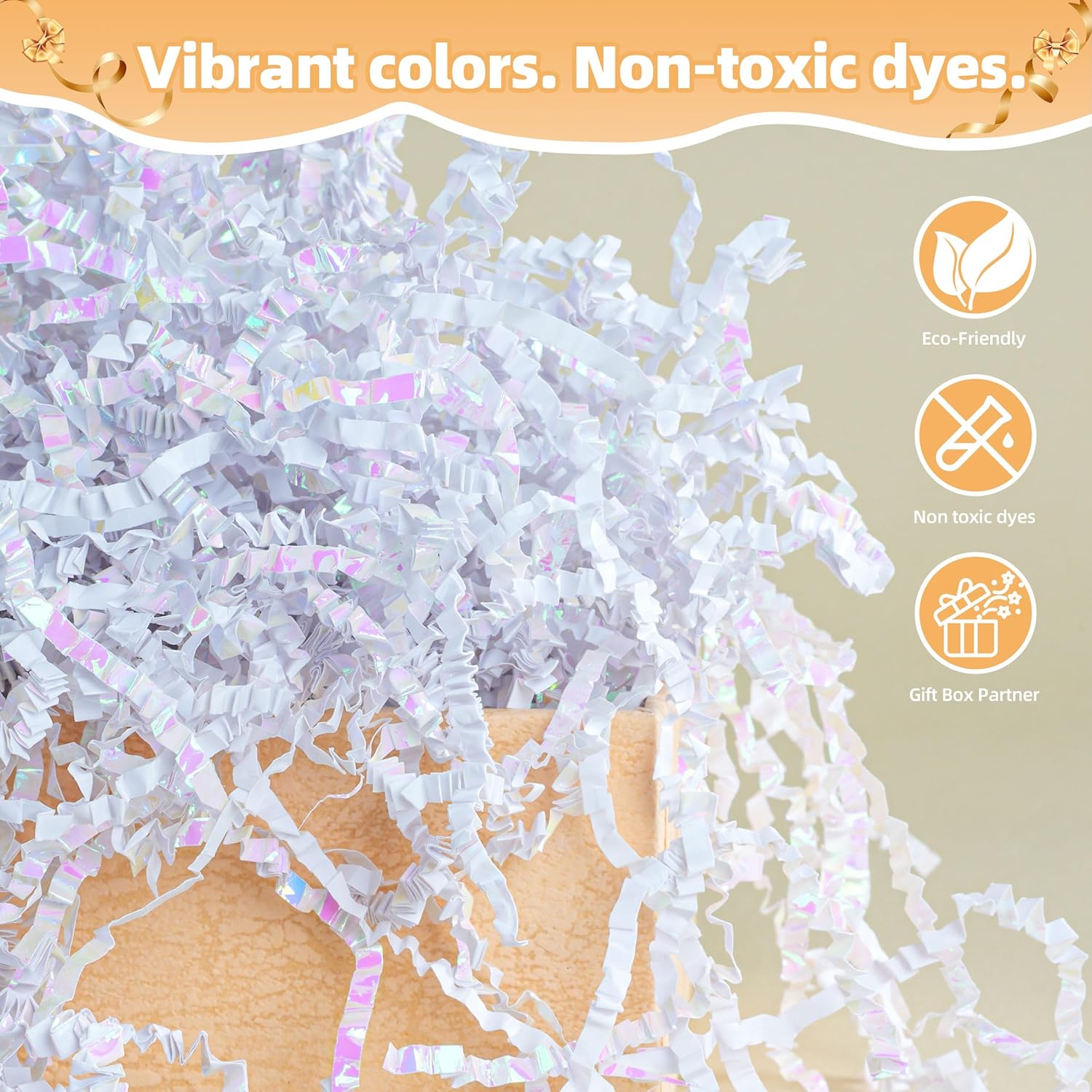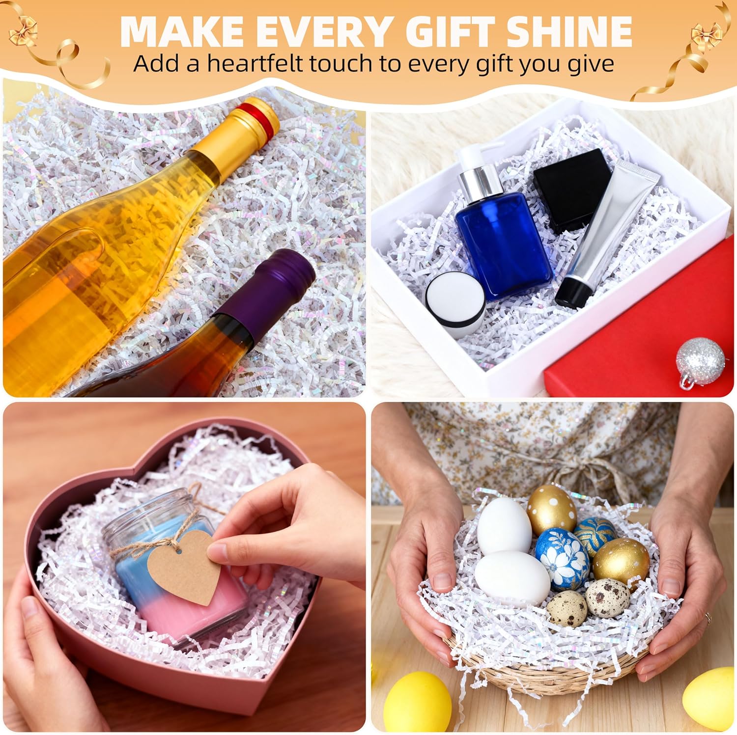 - The Perfect Gift Filler: Our crinkle paper shred is the perfect filling and packaging material for gift baskets, gift boxes, wedding party favors, and gift bags. Crinkle cut paper protects fragile items, adds a touch of elegance, and filler for gift baskets & boxes creates a stunning unboxing experience, making every gift feel extra special.
