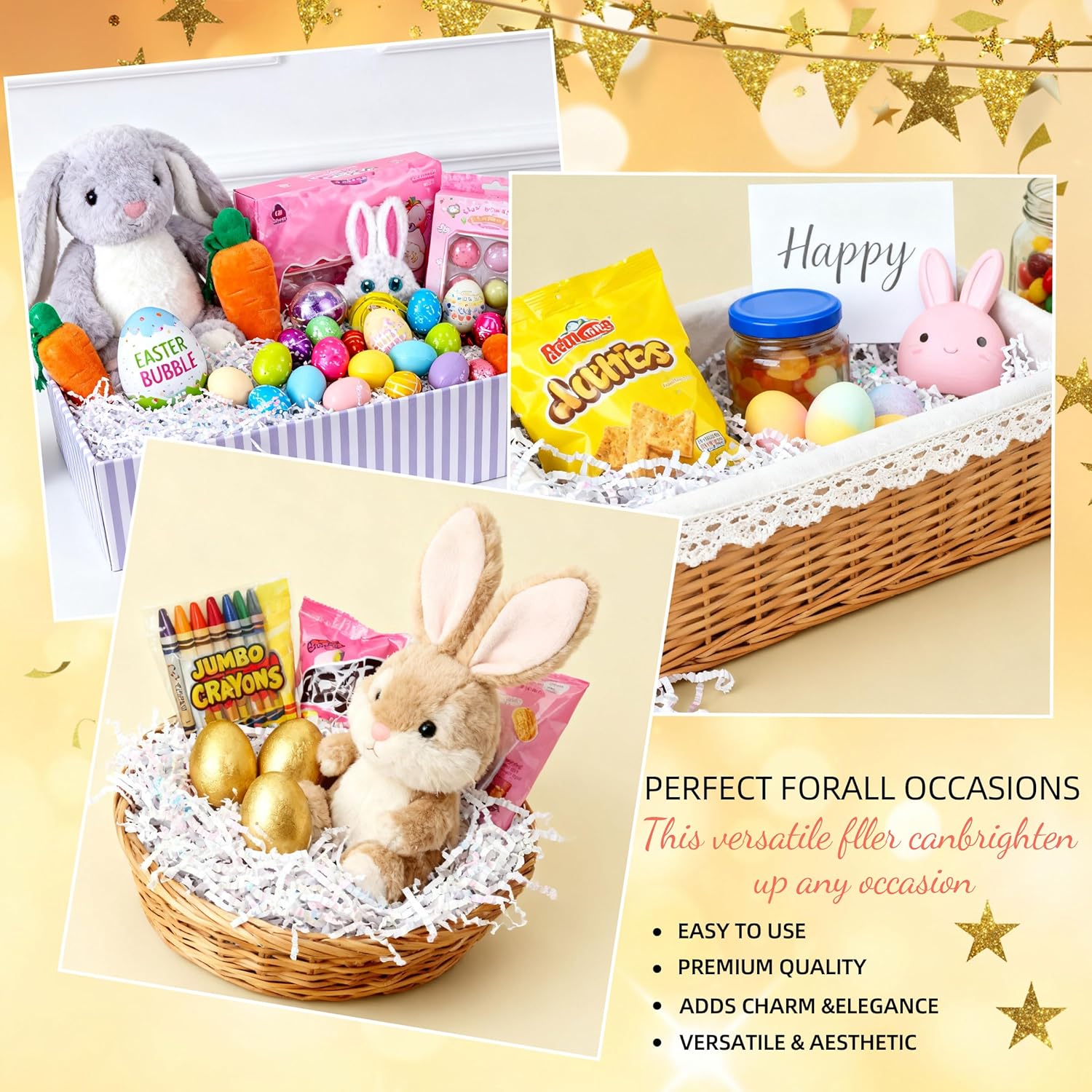 - Versatile Decorative Uses: crinkle cut paper shred filler beyond being a gift box filler and basket stuffing, it's also perfect for party table decor, wedding decorations (in the style of papel picado), craft projects, Easter basket grass, or as protective packaging filler for shipping products.