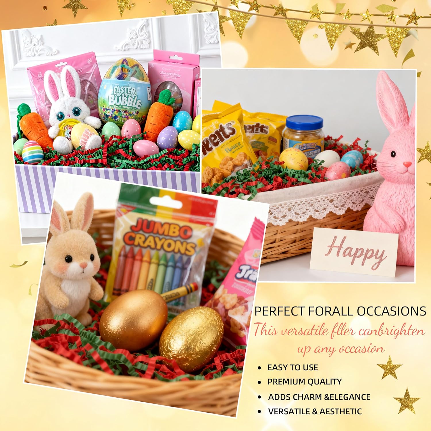 - Versatile Decorative Uses: crinkle cut paper shred filler beyond being a gift box filler and basket stuffing, it's also perfect for party table decor, wedding decorations (in the style of papel picado), craft projects, Easter basket grass, or as protective packaging filler for shipping products.