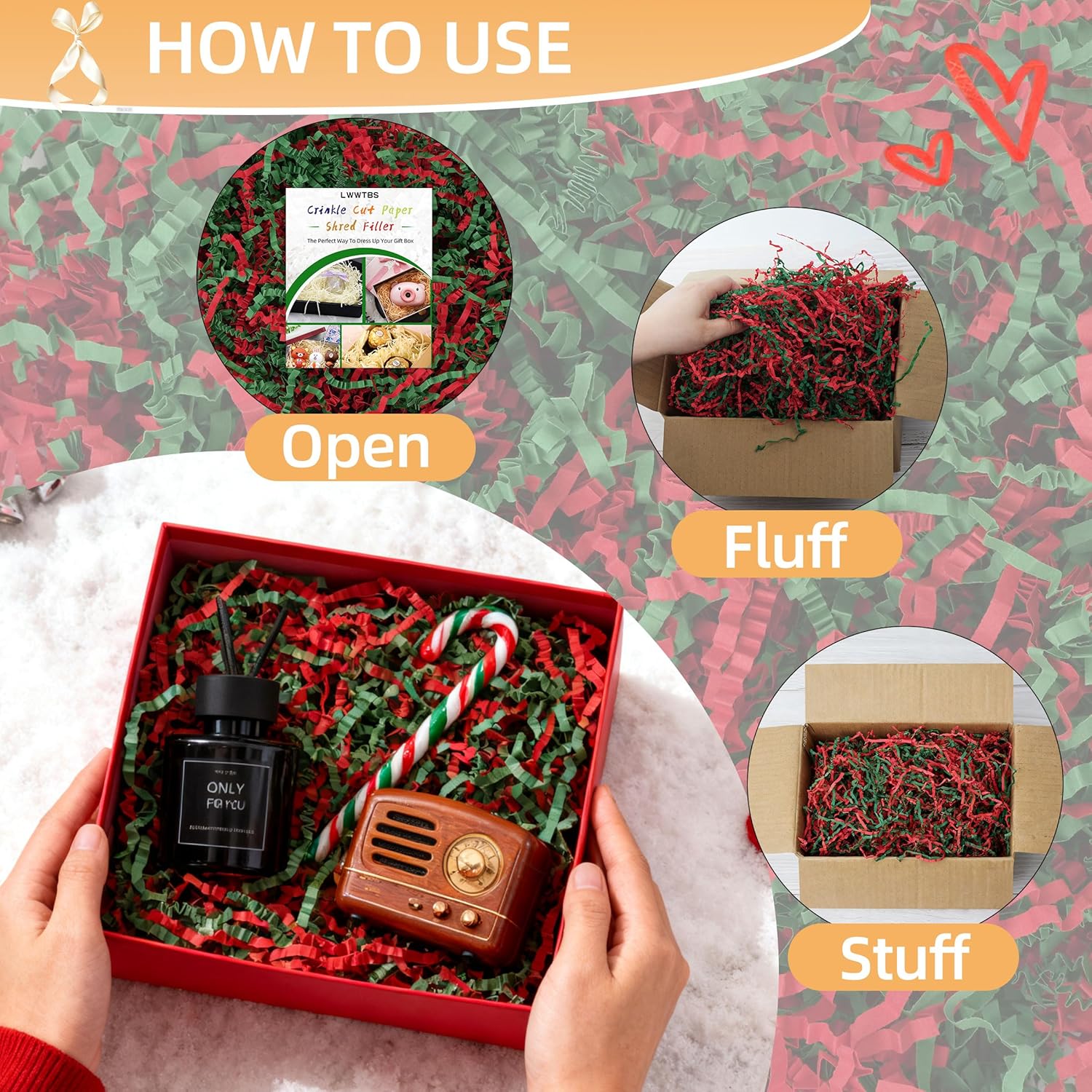 LWWTBS Crinkle Cut Paper 7oz Shredded Packing Grass Cushion Paper for Gift Baskets Christmas Wedding Birthday Bridesmaid Engagement Craft Gift boxes Bags Filler (Christmas)