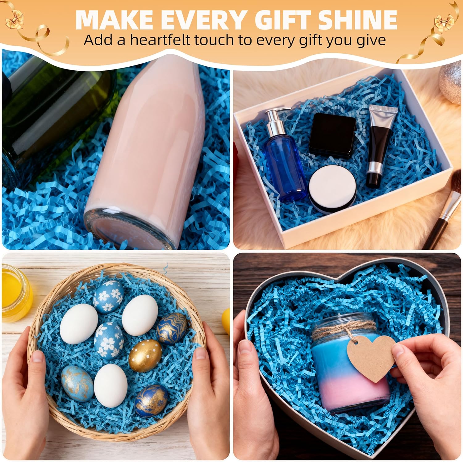 - The Perfect Gift Filler: Our crinkle paper shred is the perfect filling and packaging material for gift baskets, gift boxes, wedding party favors, and gift bags. Crinkle cut paper protects fragile items, adds a touch of elegance, and filler for gift baskets & boxes creates a stunning unboxing experience, making every gift feel extra special.