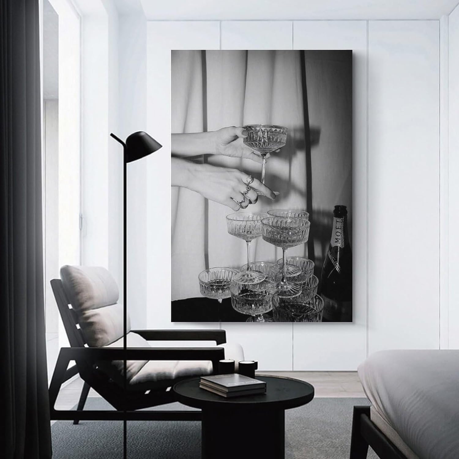 Black And White Champagne Glasses Canvas Wall Art Retro Funky Bar Cart Art Decor Retro Champagne Tower Poster Vintage Photography Wall Art Kitchen Dining Room Pub Prints 16x24inch(40x60cm)