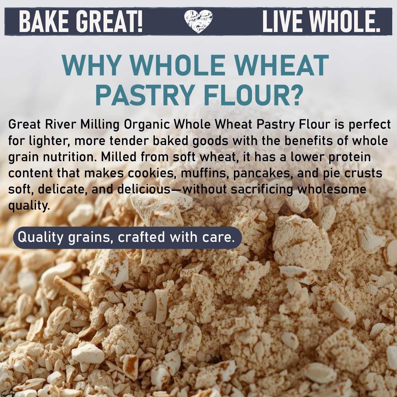 Great River Milling Organic Whole Wheat Pastry Flour | Soft Texture, Lower Gluten | USDA Organic, Non-GMO, Kosher | Ideal for Muffins, Cookies, Cakes & More | 5 Lb