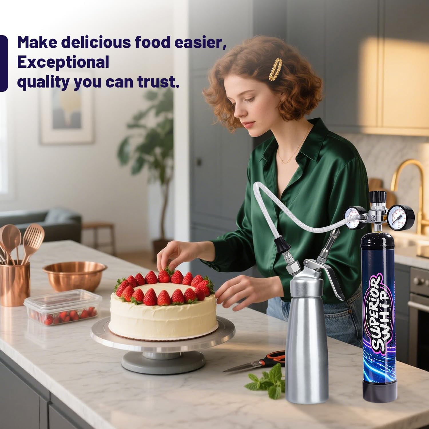 - 740g whipped cream charger tank, effortlessly creates fluffy, velvety cream, transforming whipping cream into a delightful experience. Whether crafting cream desserts, sauces or cocktails, it ensures professional-grade results every time.